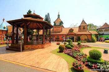 Com um visual muito bonito e tipicamente alemão, o coreto fica no centro da praça da vila e é rodeado de jardins e decks de madeira. Ali alguns personagens posam pra fotos com os turistas, como o Shrek e sua turma, quando fomos lá.