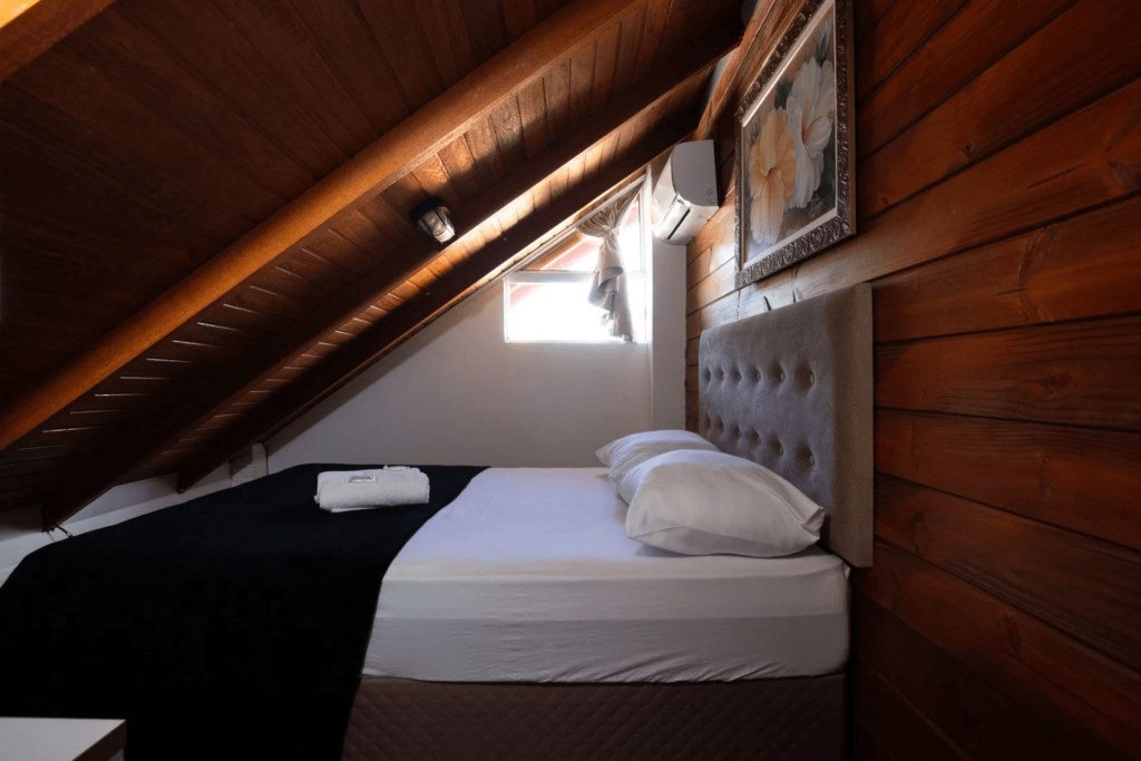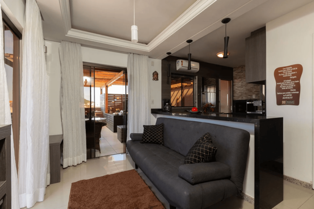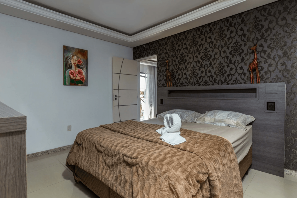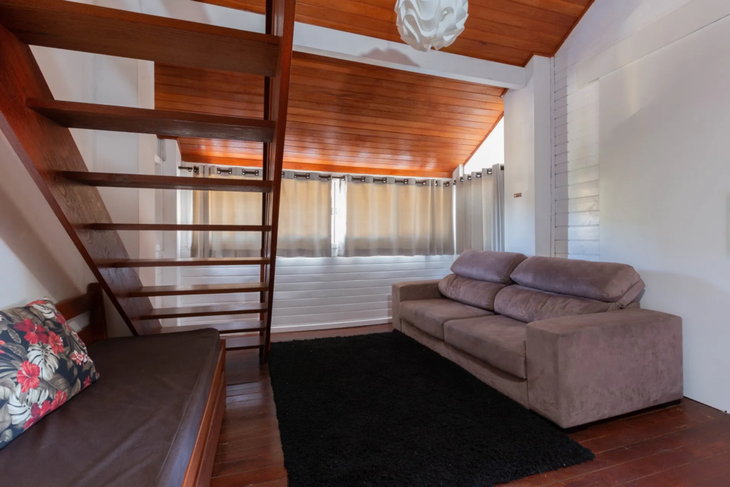 Possui 1 cama para casal queen + 1 sofá-cama para casal na sala + 1 cama box para solteiro.