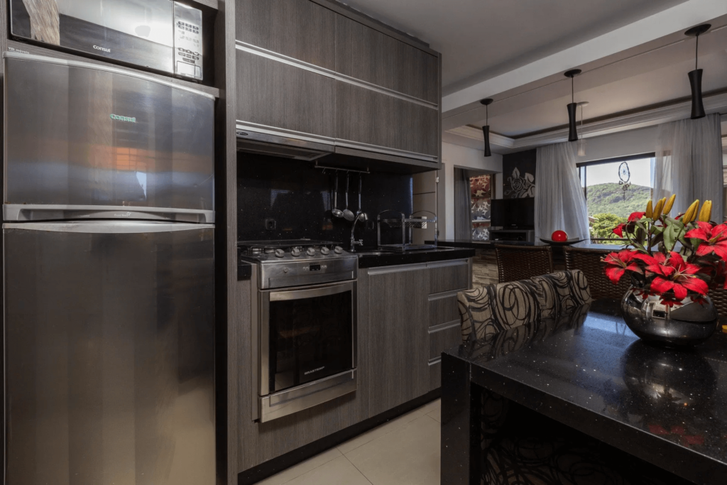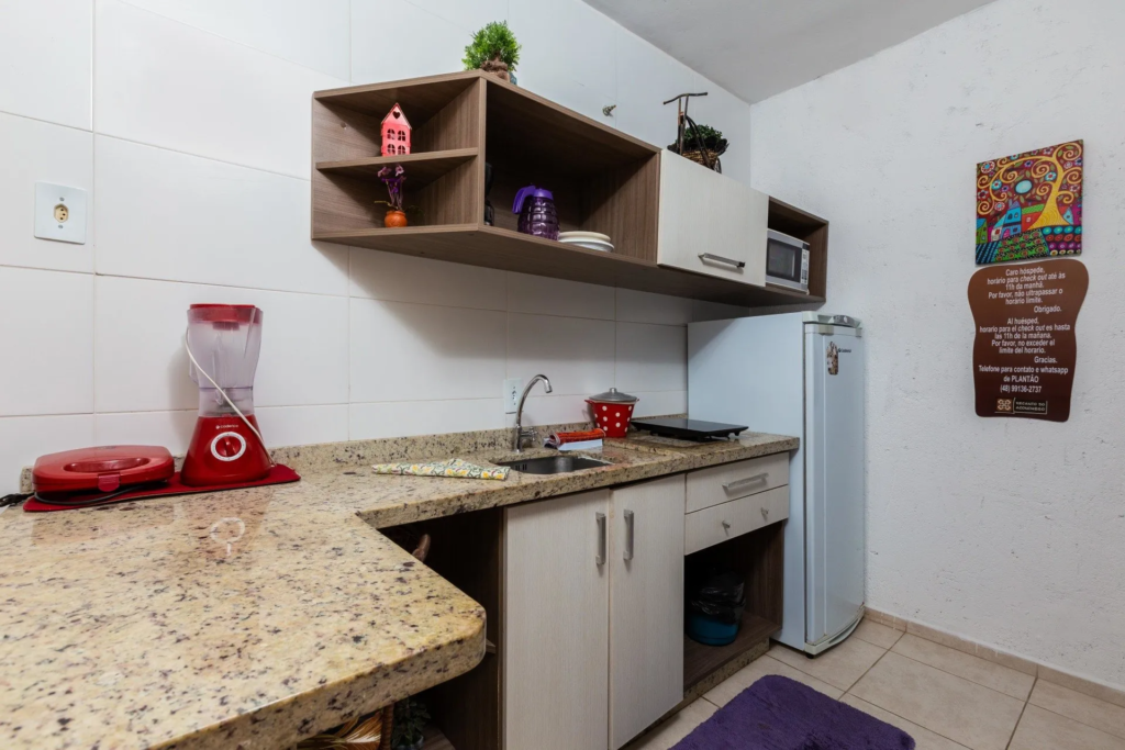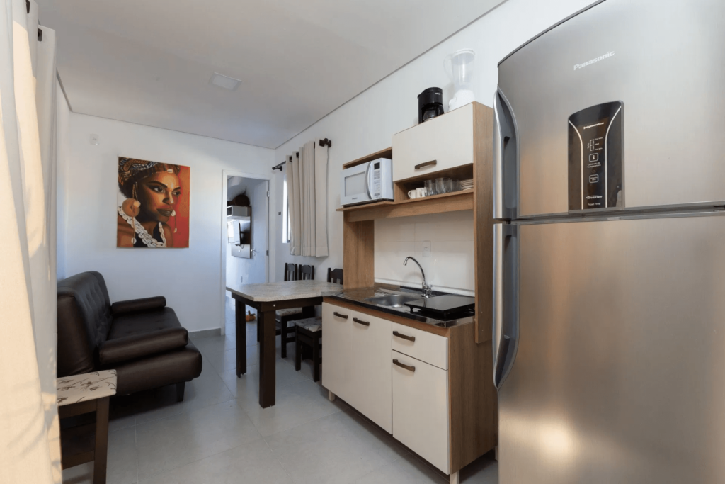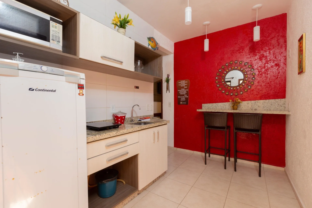 * Os apartamentos possuem cozinha completa com micro-ondas, cafeteira, liquidificador e utensílios domésticos, TV LCD sinal via satélite, ar condicionado Split no dormitório.
