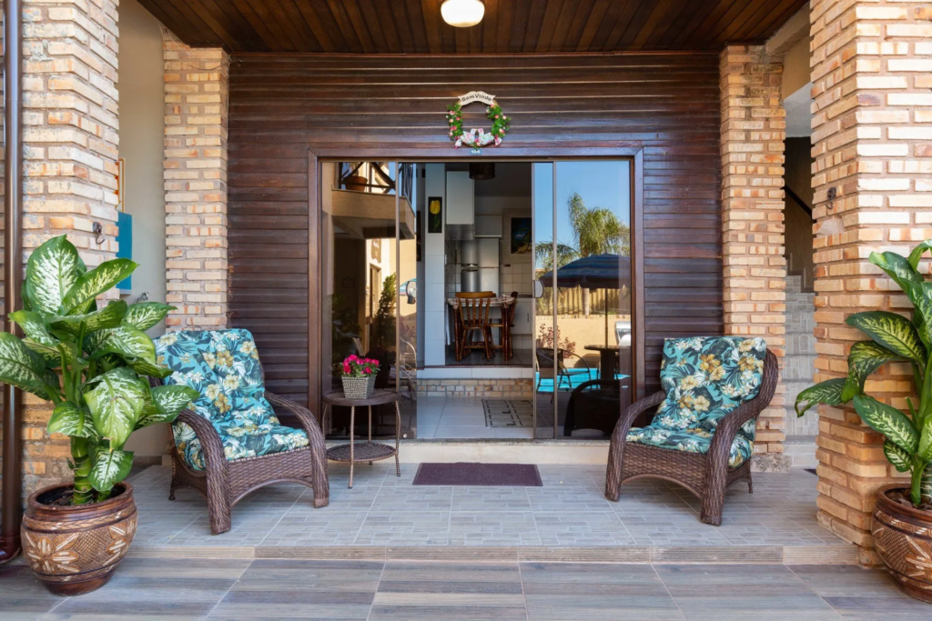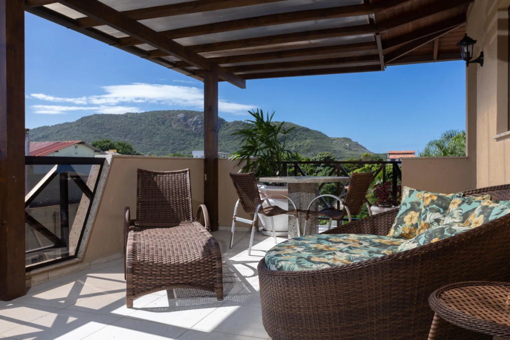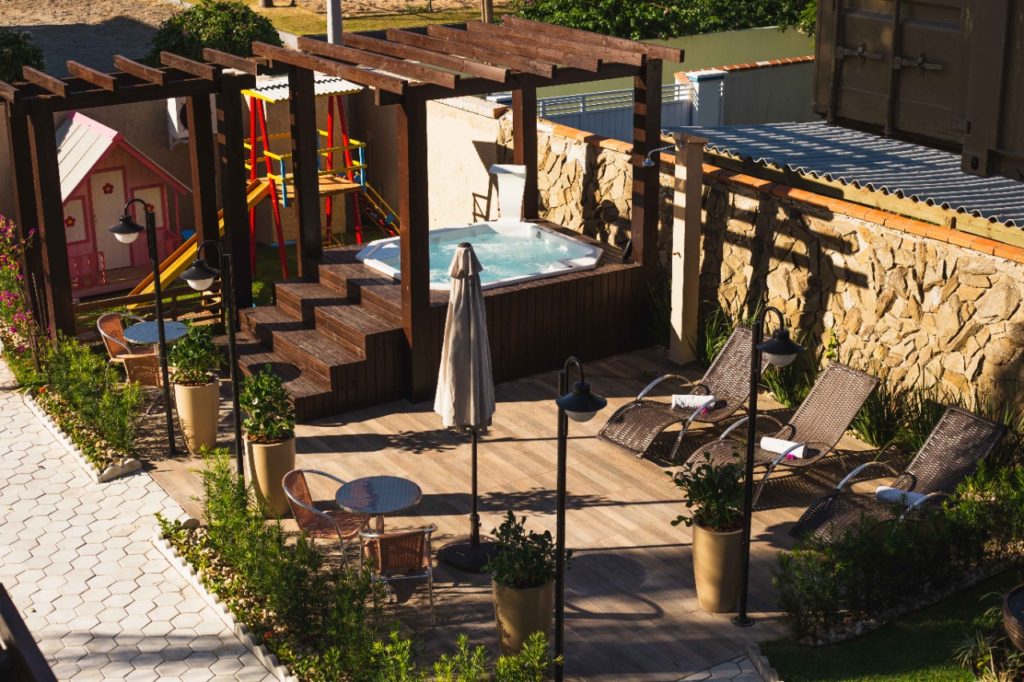 A sacada e as janelas têm vista para a área de lazer da pousada.