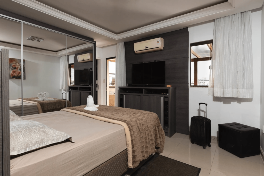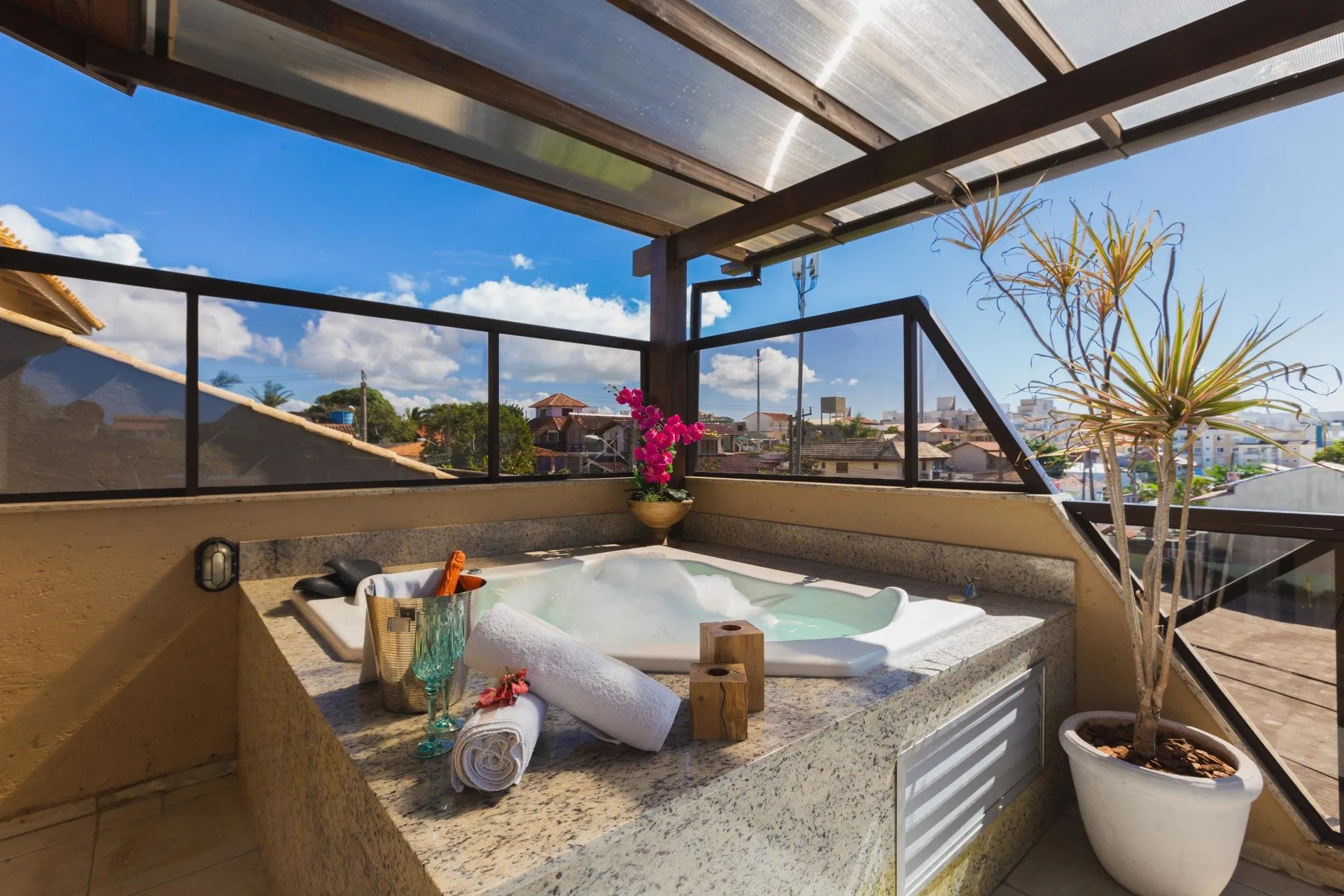 Equipada com banheira de hidromassagem com cromoterapia, cama box para casal queen e cozinha completa.